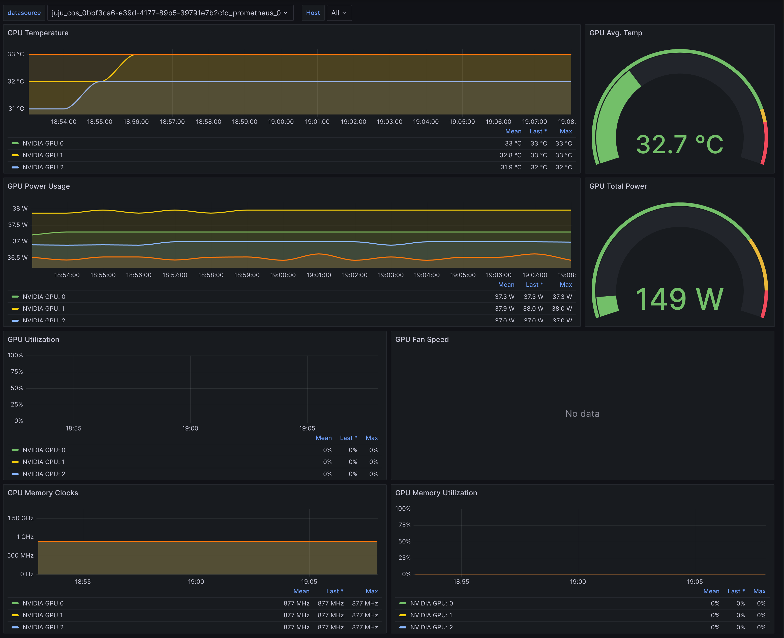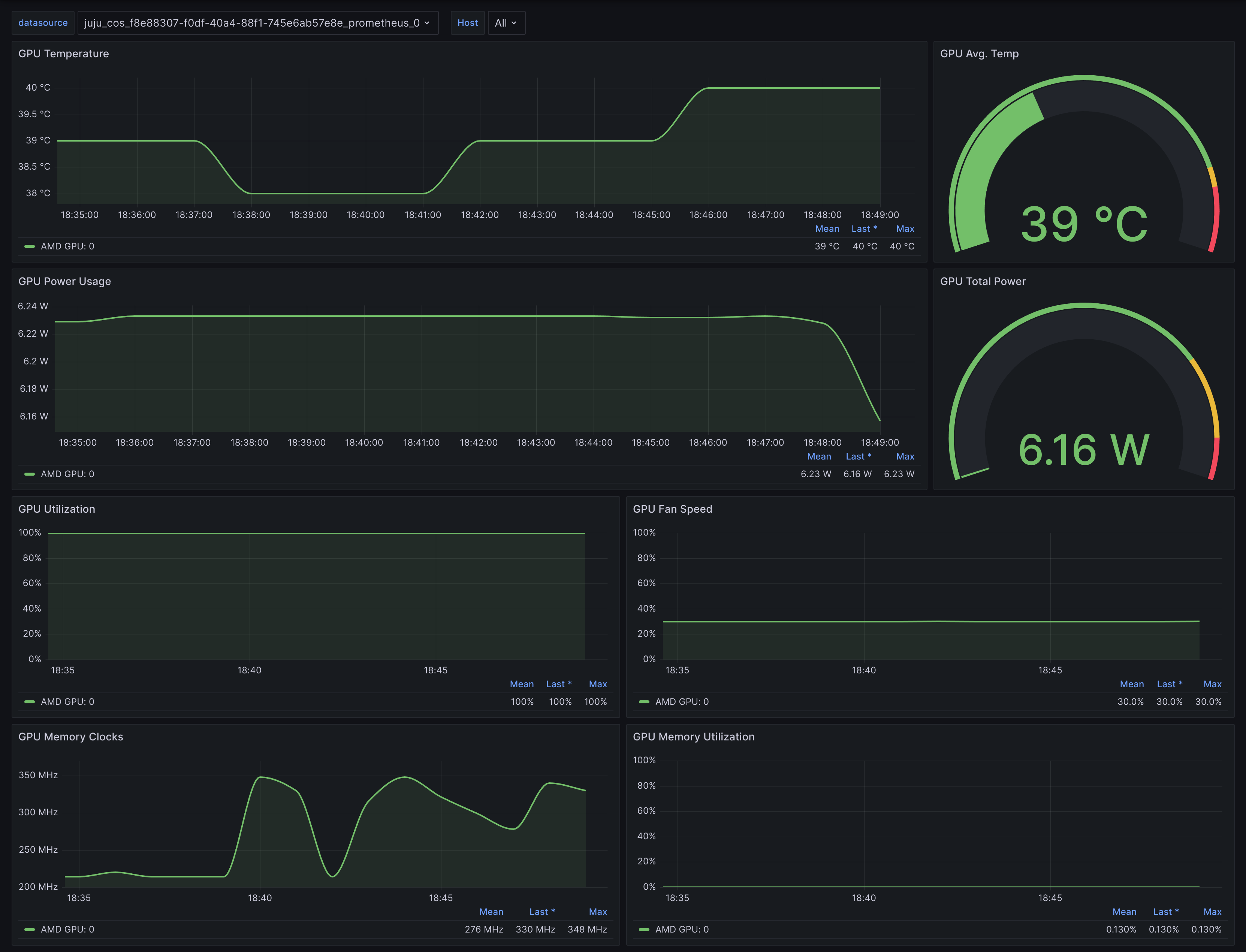 The GPU Dashboard offers essential metrics monitoring for NVIDIA and AMD GPUs. Although the metric names differ between vendors, the dashboard is able to adapt based on the GPUs available in the system. Note: some AMD-specific metrics are not yet propagated at the time of this writing, as some upstream changes are pending.