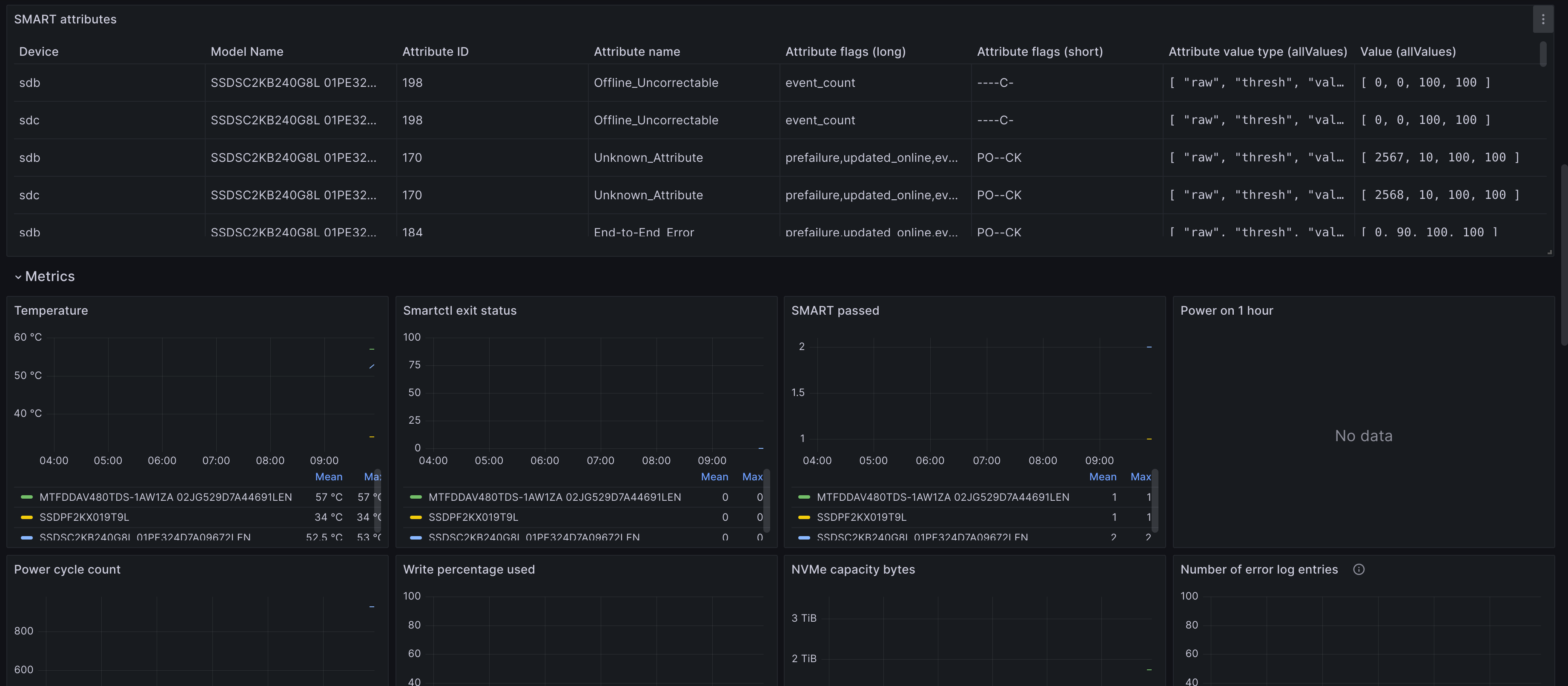 The Smartctl Dashboard displays metrics exported by the smartctl exporter. If the observed device supports the smartctl exporter, this dashboard will present all S.M.A.R.T. metrics collected.